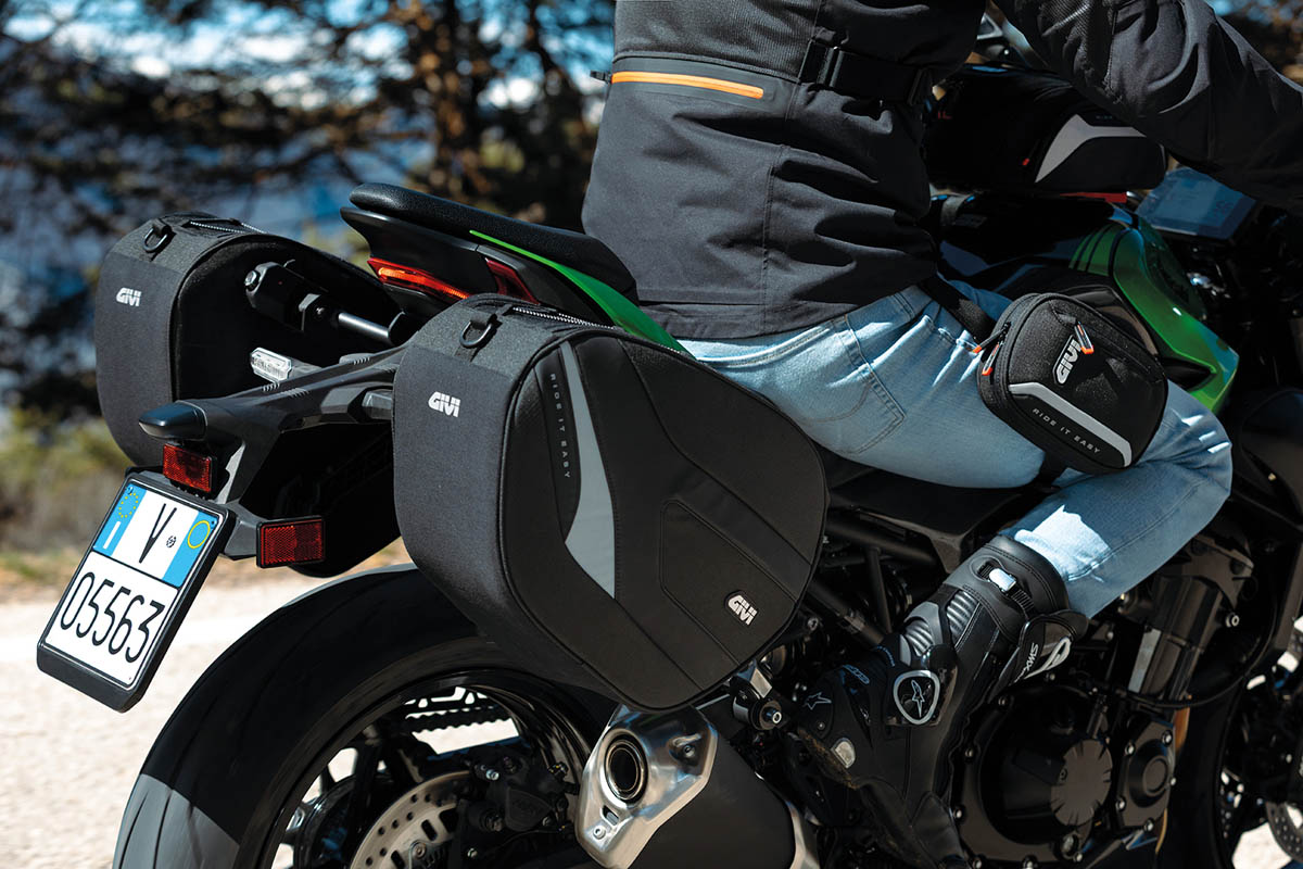 Stealth é compatível com a linha de bolsas laterais EASY12, disponíveis nas versões direita e esquerda (EASY12L / EASY12R), oferecendo uma solução versátil e coerente com a experiência GIVI. Capacidade máxima: 3 kg.